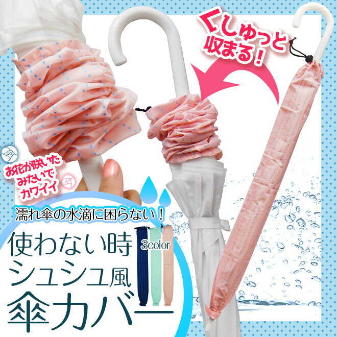 [商品用途]シュシュ、傘カバー、防滴傘カバー、防滴傘、傘用シュシュ メーカー希望小売価格はメーカーカタログに基づいて掲載しています商品名 シュシュ風傘カバー サイズ 約70cm〜10cm カラー ブルー・ピンク・ミント 素材 ポリエステル100%(内側アクリルコーティング) 洗濯 手洗いOK 商品PR もう濡れた傘を気にしない! ドット柄の傘カバー。